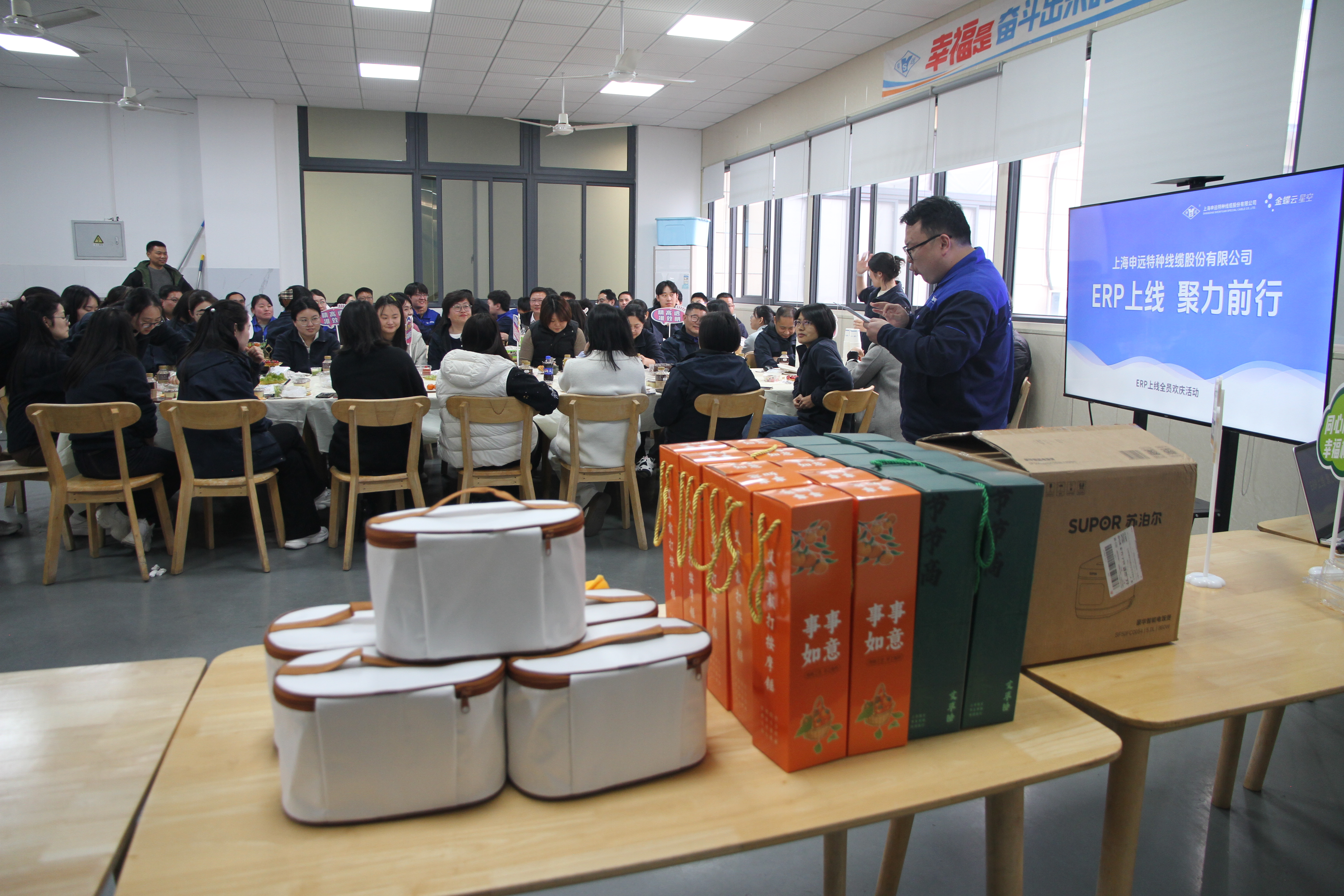 活动现场氛围热烈浓厚,主题背景板醒目亮眼,轻快音乐环绕全场。幸福委提前布置场地、准备抽奖券与丰富礼品,让每一位同事都能共享喜悦、共赴荣光。活动中,公司领导发表致辞,向全体参与项目的同事致以诚挚感谢,点明ERP上线对管理提效、流程优化、数据贯通的重要意义,鼓励大家以更高效的状态携手前行。